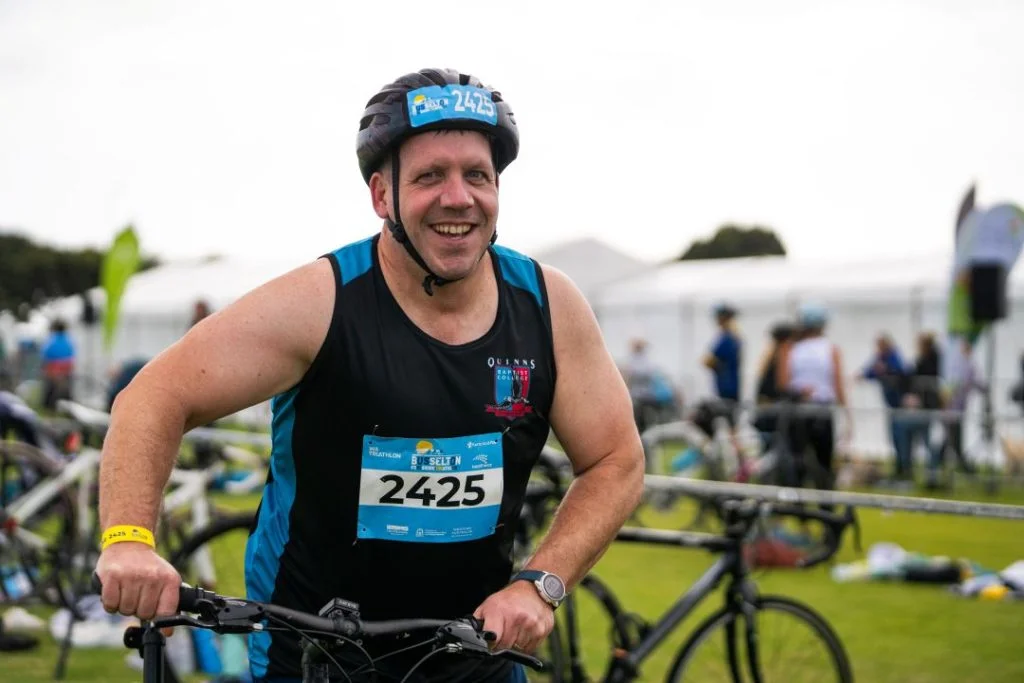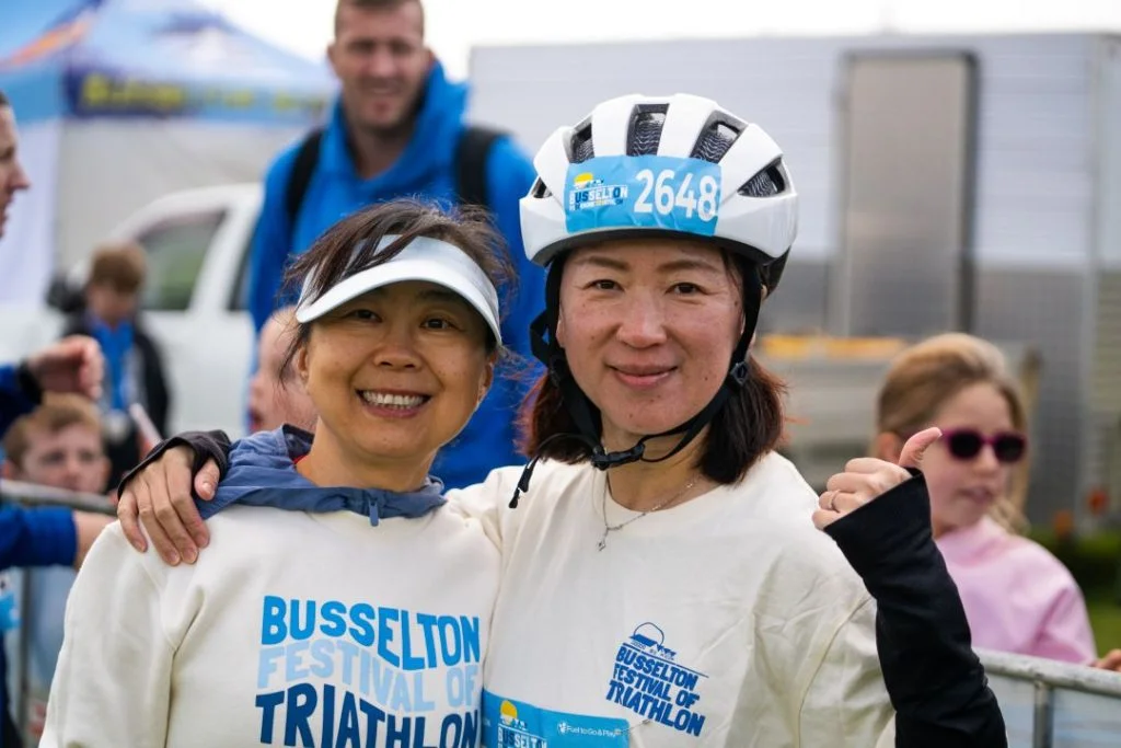 During the race, the timing chip is passed between team mates in transition (swim to bike, then bike to run), and on the last lap all team members can meet at the ‘team meeting point’ to cross the finish line together.